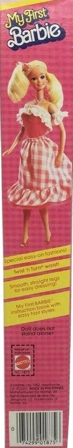 This doll was copyrighted / released in 1980. To see other dolls from this year, click here. She has the Superstar head mold. To see other dolls with this head mold, click here. She is a “My First Barbie” which means she has smooth, straight legs for easy dressing and “easy-on” fashions. She also has the “My First Barbie” face. To see other My First Barbie dolls, click here. The number 1875 is shared among several My First Barbie dolls. This doll was made in the Philippines and Taiwan.