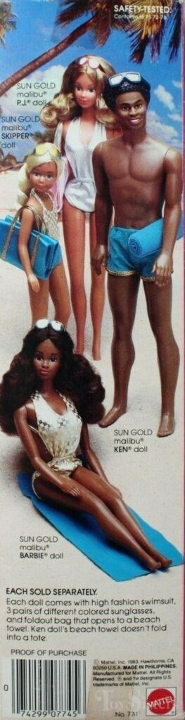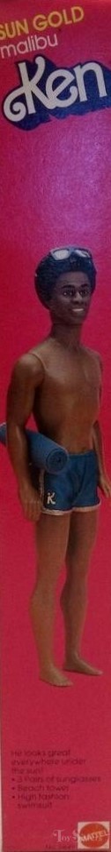 This doll was copyrighted / released in 1983 / 1984.  To see other dolls from this year, click here.  He has the 1983 Black Ken head mold.  To see other dolls with this head mold, click here.  To see other Sun Gold Malibu dolls, click here.  To see other Barbie beach dolls, click here.  This doll was made in Hong Kong.