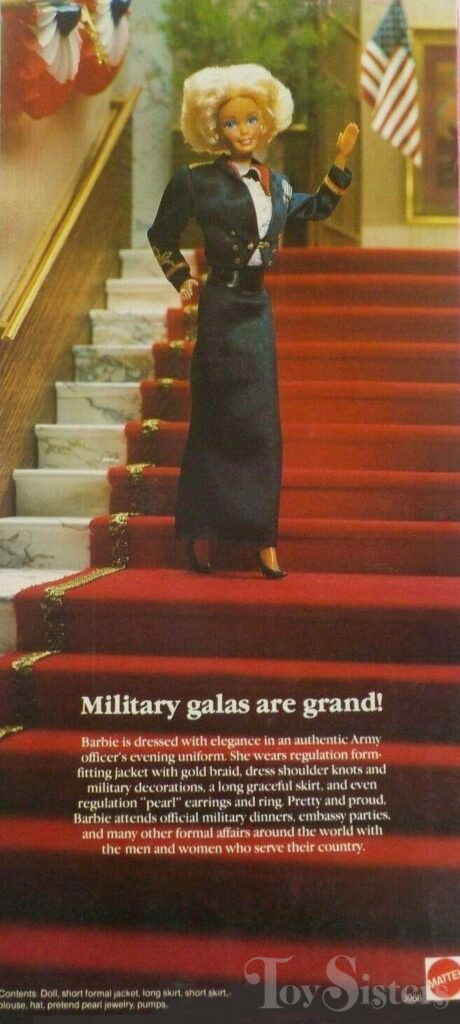 This doll was copyrighted / released in 1989. To see other dolls from 1989, click here. She has the Superstar head mold. To see other dolls with this head mold, click here. She is part of the American Beauties Collection. To see other military dolls, click here. This doll was made in China.