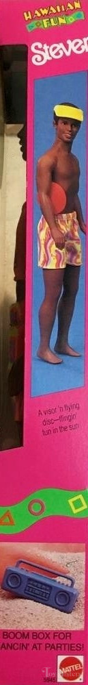 This doll was copyrighted in 1990 and released in 1991. To see other dolls from 1991, click here. He has the Steven head mold. To see other dolls with this head mold, click here. To see other Hawaiian Fun dolls, click here. To see other Barbie beach dolls, click here. This doll was made in Malaysia.