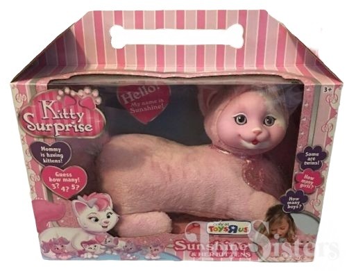 Sunshine is a Kitty Surprise mommy plush released by the toy line Just Play. She could come with three, four, or five kittens tucked in her tummy pouch. To see other Just Play mommy cats, click here. Sunshine was a Toys R Us exclusive.