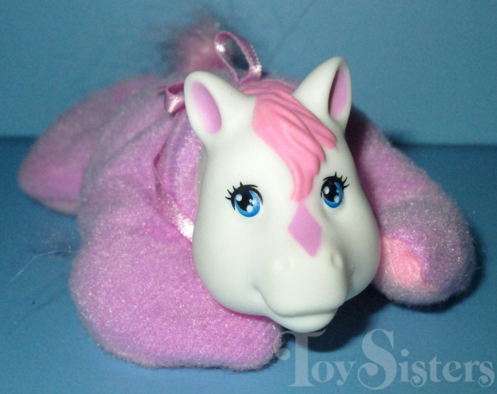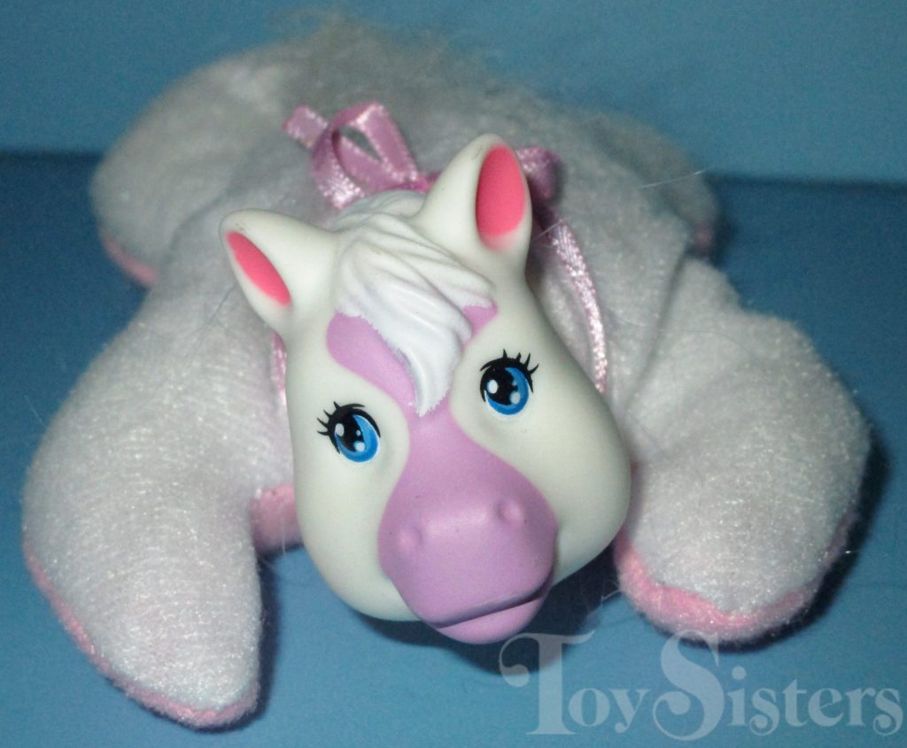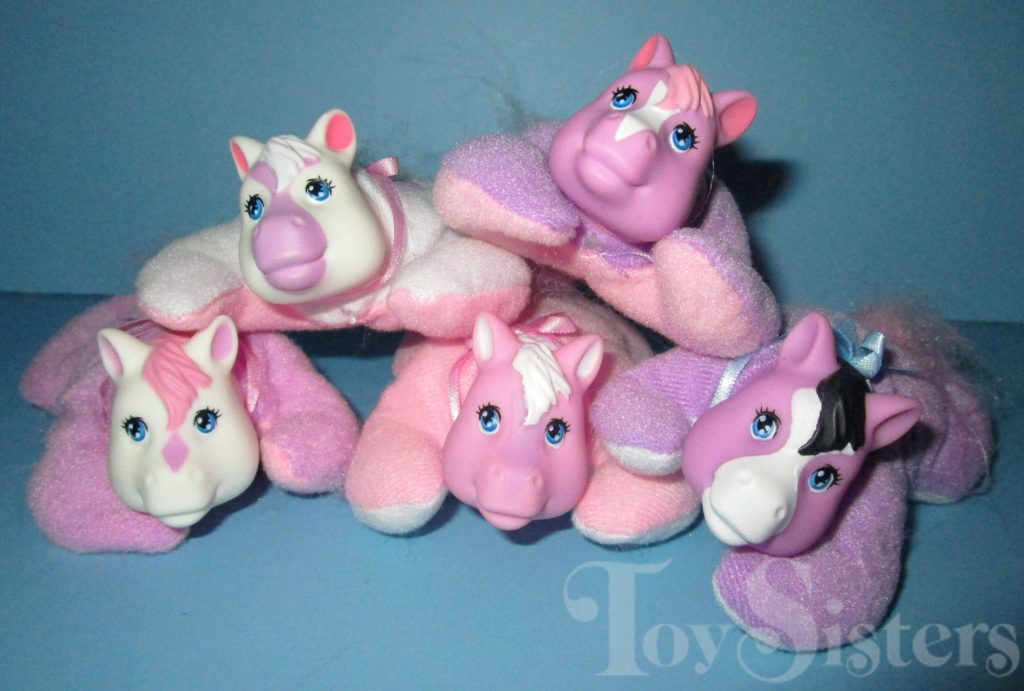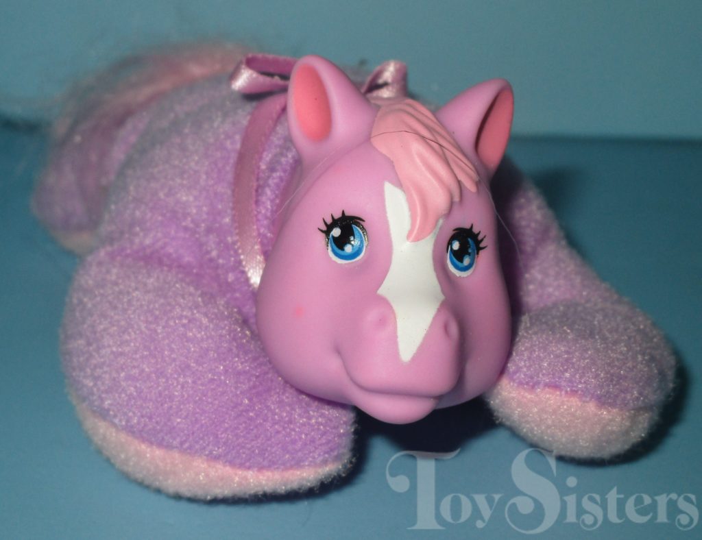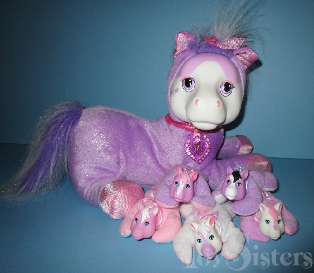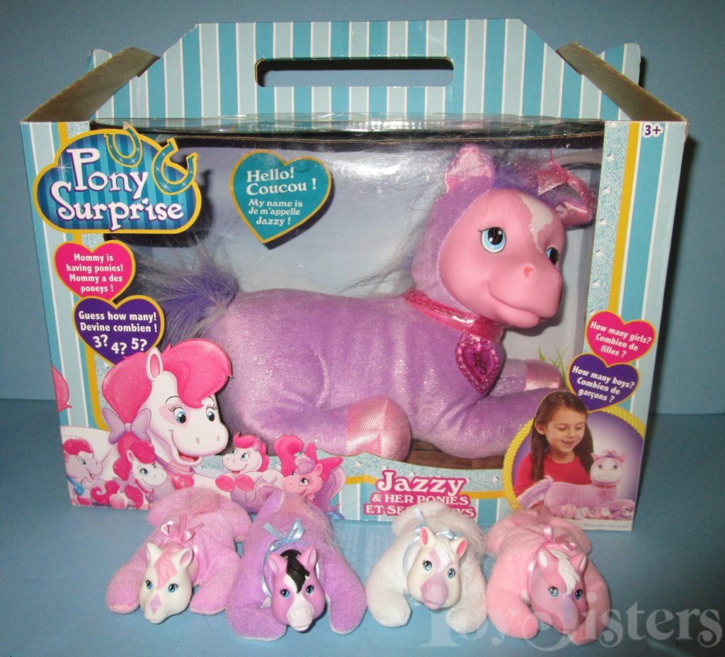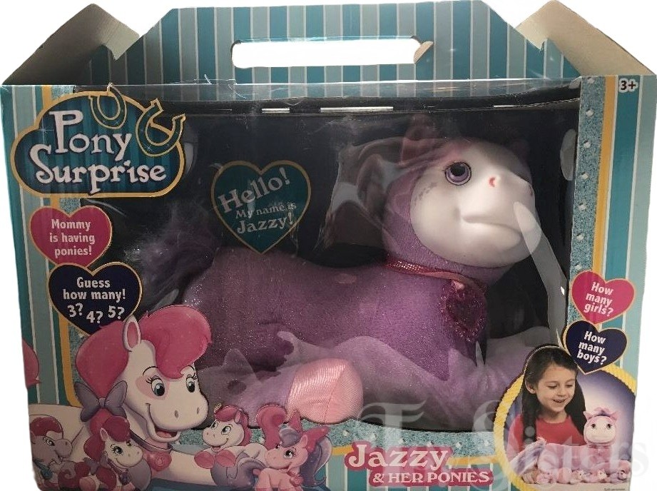 Jazzy is a Pony Surprise mommy plush released by the toy line Just Play. She could come with three, four, or five babies tucked in her tummy pouch. To see other Just Play mommy ponies, click here. Jazzy was a Toys R Us exclusive. Mostly. For a brief time, a while after her initial release, she showed up at some Walmart stores.