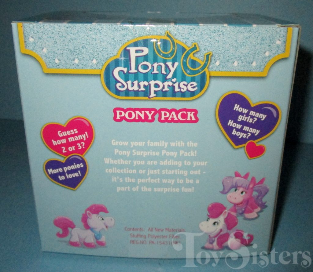 The Pony Surprise Pony Pack Ponies came packaged with one pony visible, and one (or two, if you were lucky) pony hidden. They did repeat between packs, so there wasn’t a logical way to game the system and get the one you wanted. To view the other Just Play Pony Surprise plush, click here.