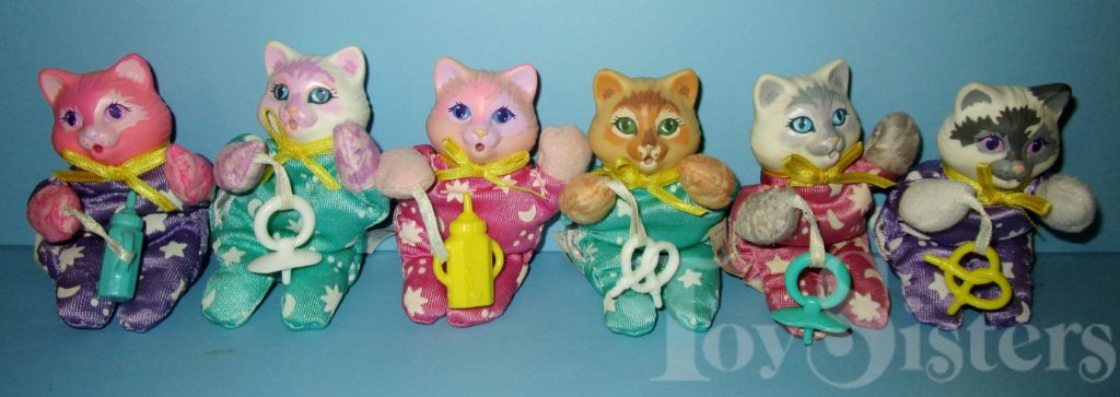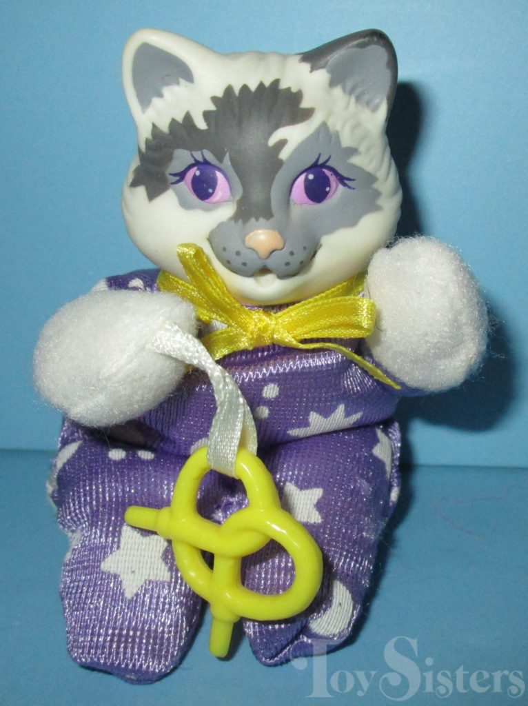 The Sleep ‘n Surprise babies came released in single packs. It was a surprise if they were boys or girls- once you purchased them, you could pull down a flap on their pajamas to reveal their gender. Beats other investigatory methods, methinks. To view other types of Hasbro Kitty Surprise kittens, click here.