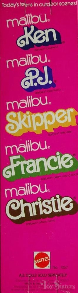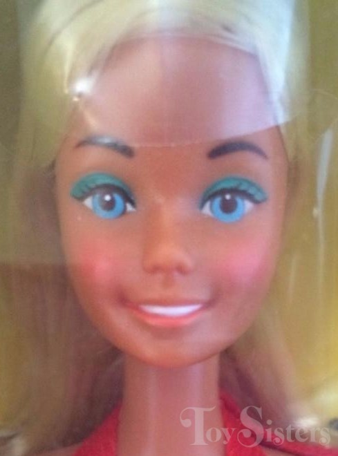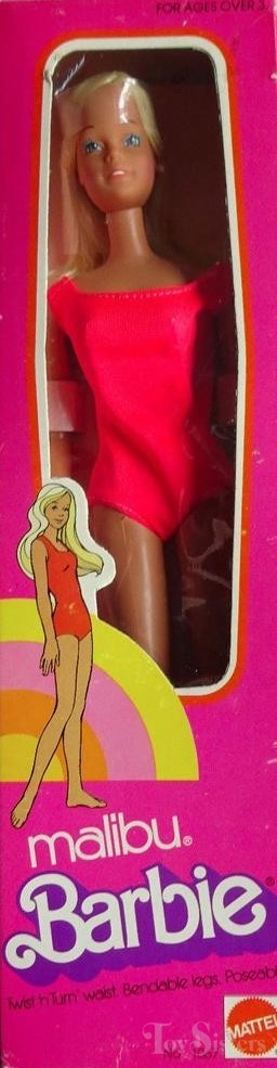 This doll was copyrighted in 1974 on the “The Sun Set” box and 1975 on the Malibu box. In terms of release years, it was released onto shelves at least up to 1977 (when the Superstar head mold debuted). To see other dolls from 1977, click here. This doll started with the Stacey head mold and then switched to the Superstar head mold. To see other dolls with the Superstar head mold, click here. Her swimsuit changes styles during the course of her releases. The number 1067 is used for several Barbie Malibu dolls. To see other Barbie swimsuit dolls, click here. The Superstar version of this doll has the Malibu face.