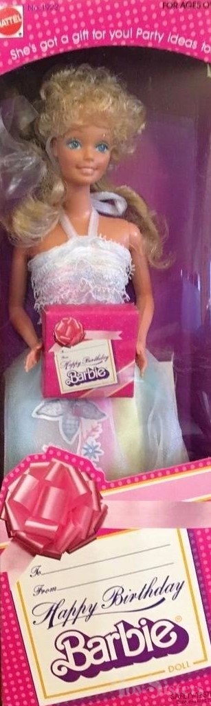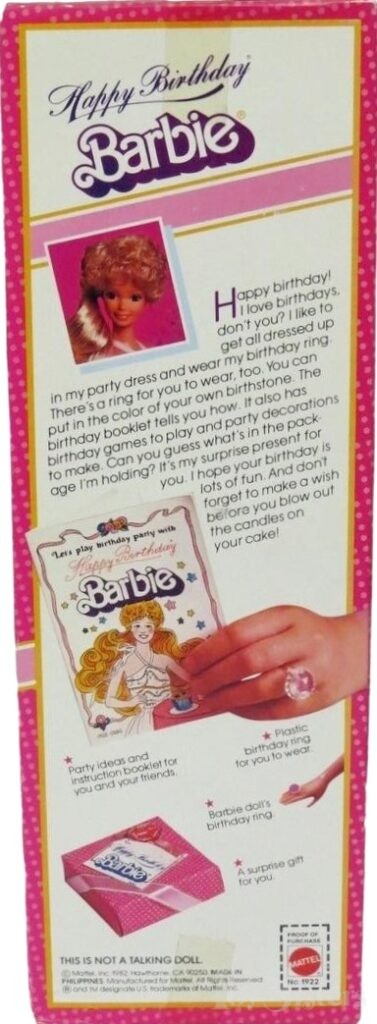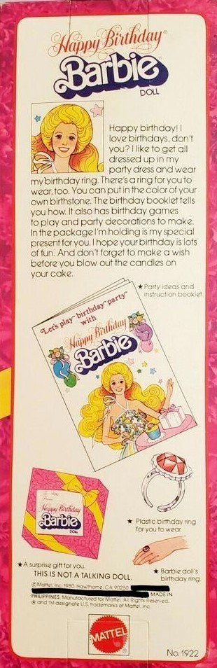The earlier version of this doll was copyrighted / released in 1980 / 1981. To see other dolls from 1981, click here. A second version of this doll was released in 1982. She has slightly different makeup brightness, smaller ruffles on her bodice, and an updated box. Both dolls have the Superstar head mold. To see other dolls with this head mold, click here. To see other Birthday dolls, click here. This doll was made in the Philippines.