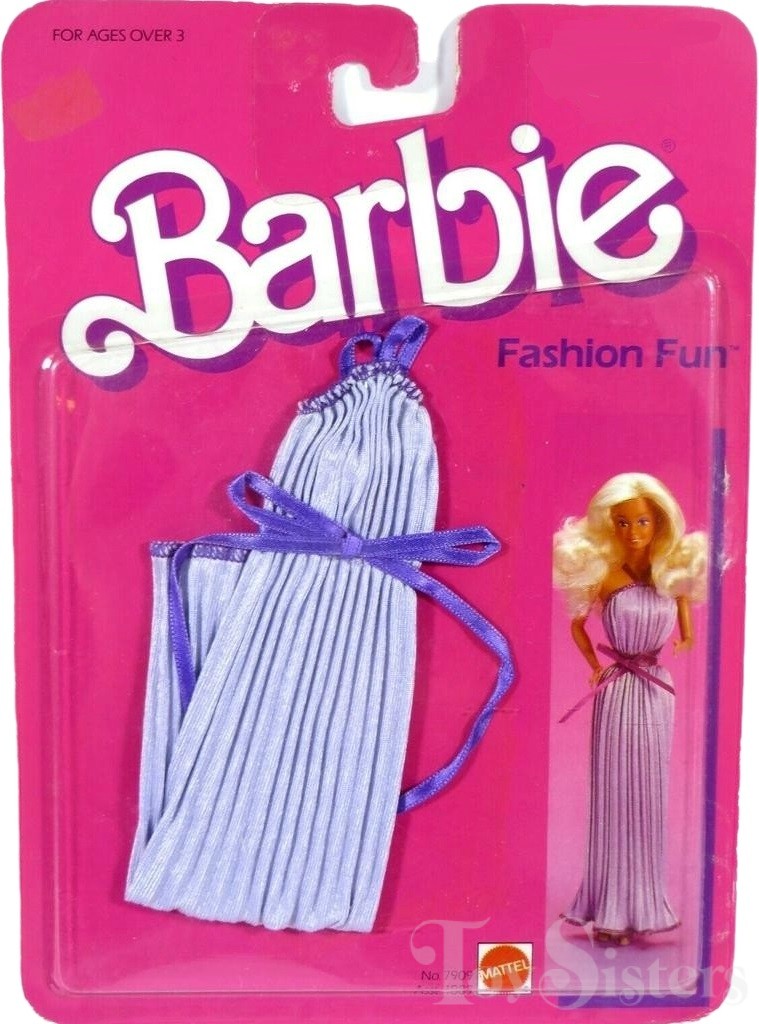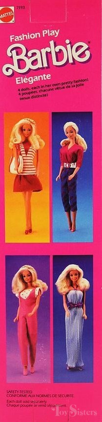 This Fashion Play #7193 doll was released to foreign markets in 1983. To see other dolls from this year, click here. The backcard for this doll shows four different outfits, all of which were released separately on this doll. She has the Superstar head mold. To see other dolls with the Superstar head mold, click here. Each fashion worn by this doll was also released separately.
