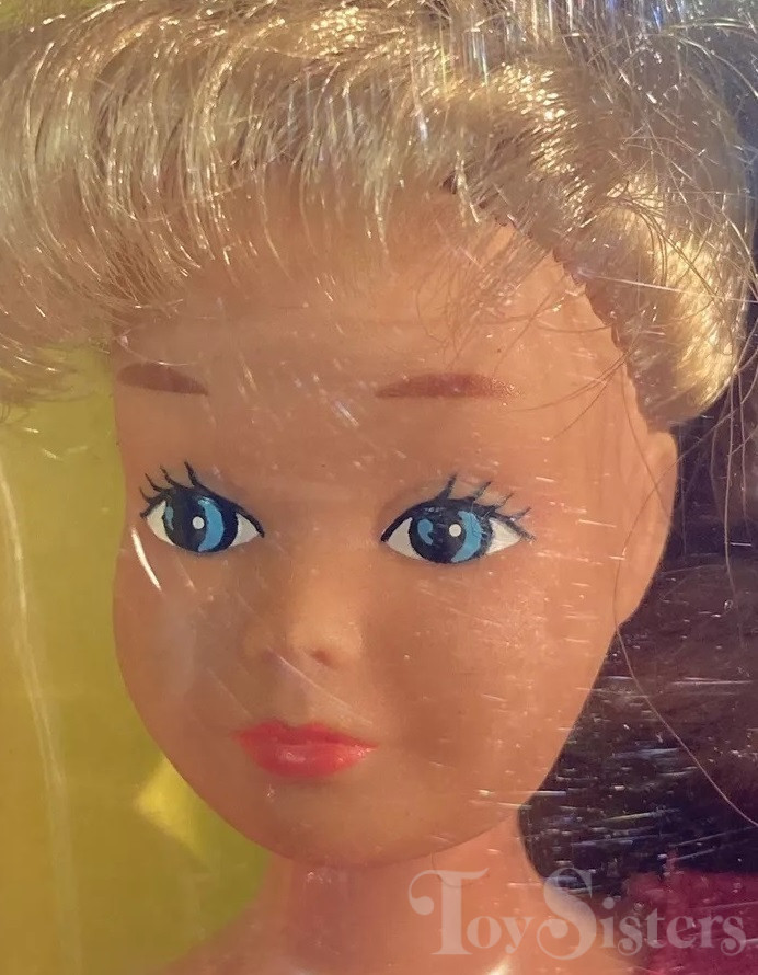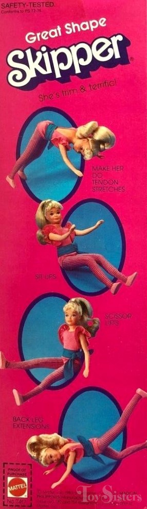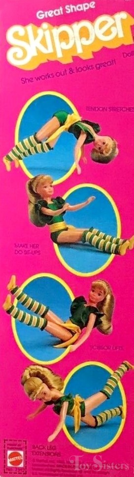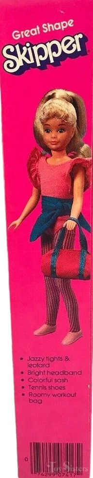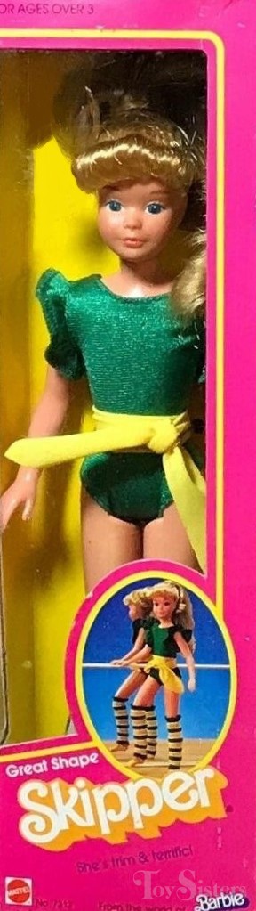 This doll was copyrighted / released in 1983 / 1984. To see other dolls from 1984, click here. She has the Skipper #1 head mold. To see other dolls with this head mold, click here. To see other Great Shape dolls, click here. In the UK/Europe, Great Shape Skipper wears an alternate green color and has a different number (#7312). Great Shape Skipper was manufactured in either Hong Kong or the Philippines.