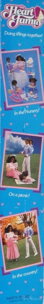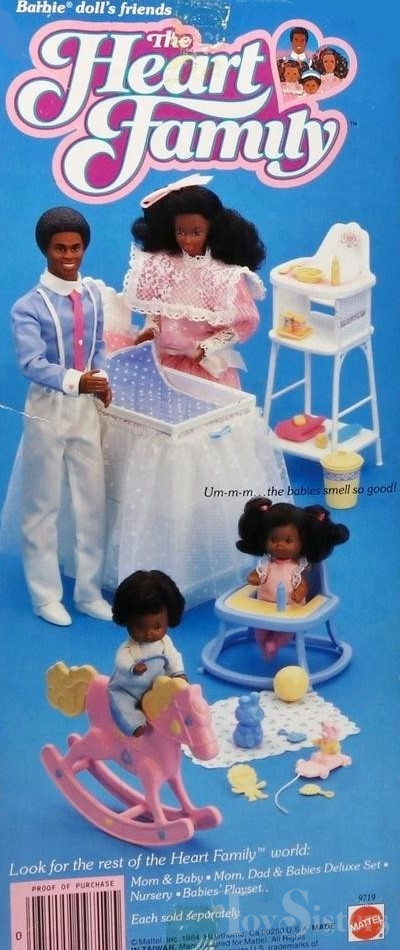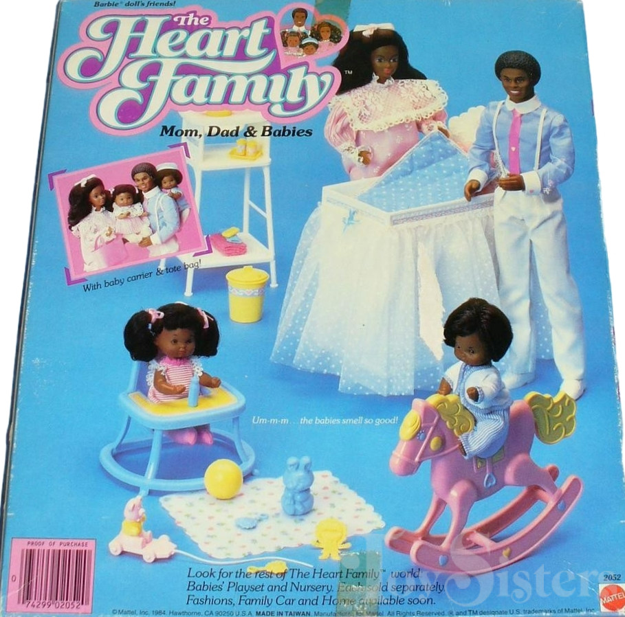The Heart Family dolls were marketed as Barbie doll’s friends.  This set was copyrighted / released in 1984.  To see other Barbie dolls from 1984, click here.  The dad has the 1983 Black Ken head mold.  To see other dolls with this head mold, click here.  The baby is in the Rosebud style.  To see other Rosebud babies, click here.  This doll set was manufactured in Taiwan.