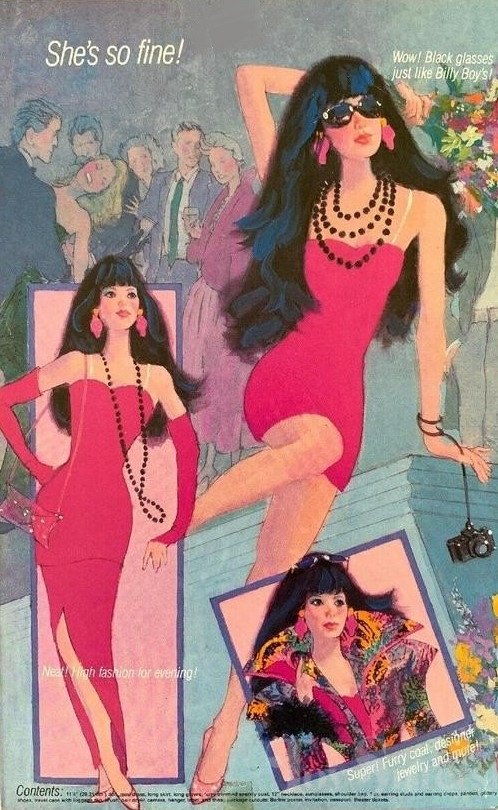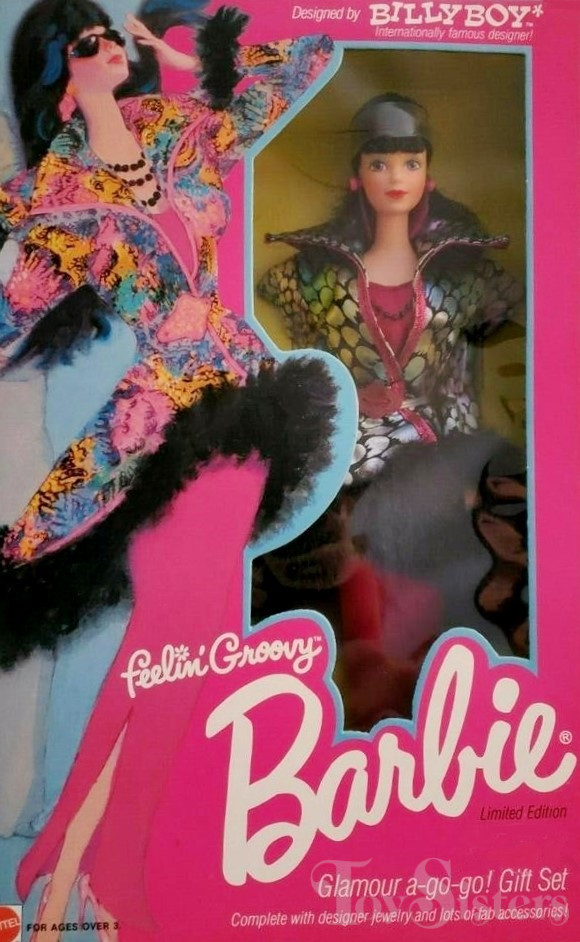 This doll was released in 1986. To see other dolls from 1986, click here. She has the Steffie head mold. To see other dolls with this head mold, click here. Billy Boy designed this doll and one other for Mattel (Le Nouveau Theatre de la Mode Barbie). Feelin’ Groovy Barbie was manufactured in China.