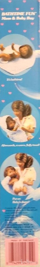 The Heart Family dolls were marketed as Barbie doll’s friends. This set was copyrighted in 1987. To see other Barbie dolls from 1987, click here. The mom has the Steffie head mold. To see other dolls with this head mold, click here. The baby is in the Rosebud style. To see other Rosebud babies, click here. This doll set was manufactured in China.