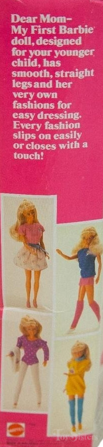 This doll was copyrighted / released in 1986 / 1987. To see other dolls from 1987, click here. She has the Superstar head mold. To see other dolls with this head mold, click here. She is a “My First Barbie” which means she has smooth, straight legs for easy dressing and “easy-on” fashions. To see other My First Barbie dolls, click here. To see other ballerina Barbie dolls, click here. This doll also came in Hispanic and African American versions.