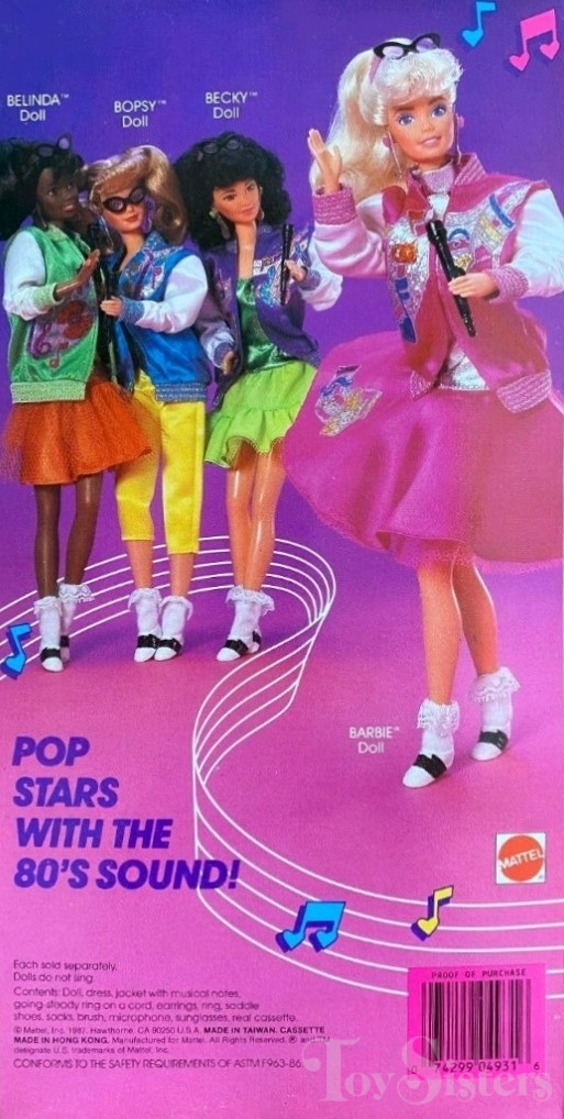 This doll was copyrighted / released in 1987 / 1988. To see other dolls from 1988, click here. She has the Kira head mold. To see other dolls with this head mold, click here. To see other Barbie and the Sensations dolls, click here. This doll was made in China.