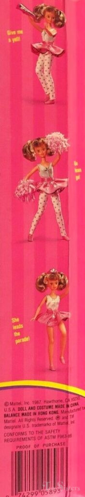 This doll was copyrighted / released in 1987 / 1988. To see other dolls from 1988, click here. She has the Teen Fun Skipper head mold. To see other dolls with this head mold, click here. To see other Teen Fun Skipper dolls, click here. To see other Cheerleader dolls, click here. This doll was made in China.