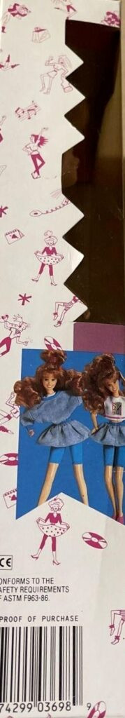 This doll was copyrighted / released in 1988 / 1989. To see other dolls from 1989, click here. She has the Starr Tracy / Chelsie head mold. This is the only use of this head mold in the Barbie line (the head first appeared in the Mattel Starr doll line). To see other head molds, click here. To see other High School / Teen Looks Jazzie dolls, click here. This is the only appearance of this Chelsie character (though the name is reused for other Barbie characters). This doll was made in Malaysia.