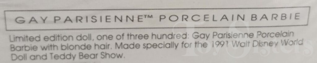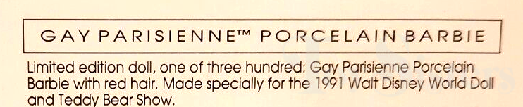 The primary version of this doll is a brunette, but a blonde version and a redhead version were made specially for the 1991 Walt Disney World Doll and Teddy Bear Show (both of these variants were limited to 300 pieces).
