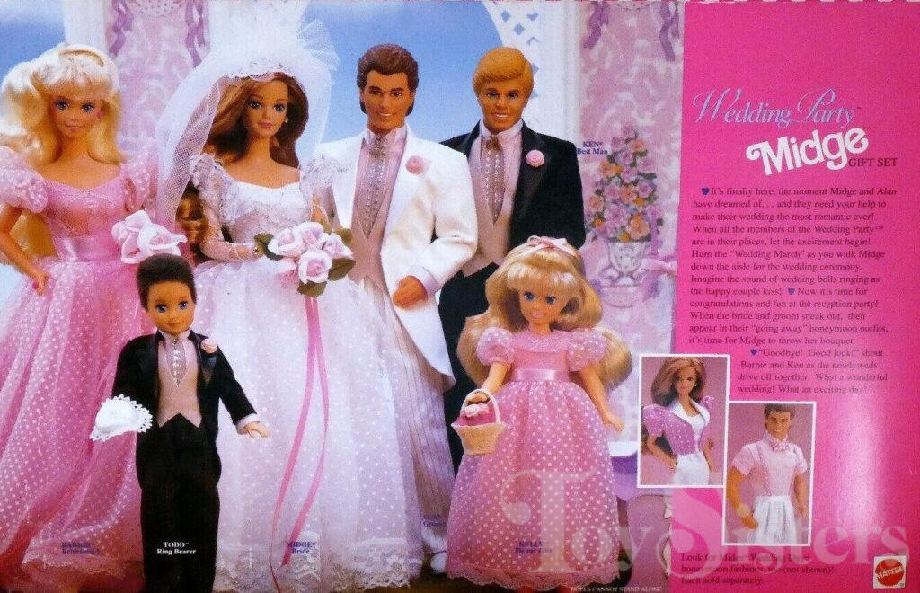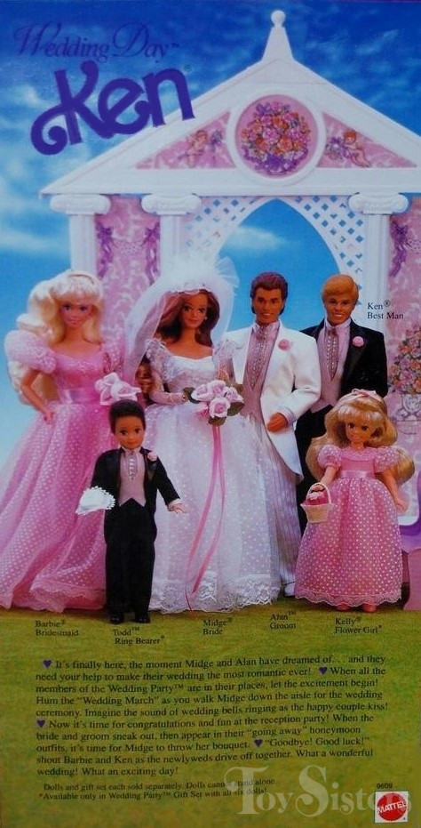 The Wedding Day series commemorates the wedding of Midge and Alan after several decades of courtship (though Alan spelled his name “Allan” in the 60s). To see other Wedding Day dolls, click here. Wedding Day Ken came packaged as a single release and in a multipack with the full bridal party.