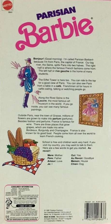 This doll was copyrighted / released in 1990 / 1991. To see other dolls from 1991, click here. She has the Steffie head mold. To see other dolls with this head mold, click here. This doll was made in China and is part of the Dolls of the World series (DOTW). To see the other Dolls of the World from 1991, click here. To see all the other Dolls of the World, click here.