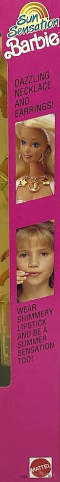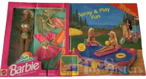 Additionally, Sun Sensation Barbie came bundled with a playset and extra fashions in the Spray & Play Fun Set. She also sometimes came bundled in the 1992 Barbie Deluxe 100 Piece Gift Set (#7151) in place of the usual doll.