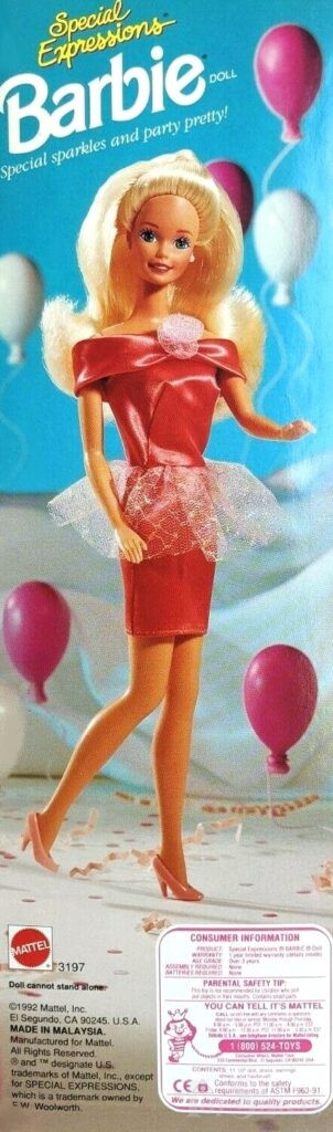 This doll was copyrighted / released in 1992. To see other dolls from 1992, click here. She has the Superstar head mold. To see other dolls with this head mold, click here. This doll was a Woolworth store exclusive manufactured in Malaysia. There is also a Hispanic version and an AA version of this doll.