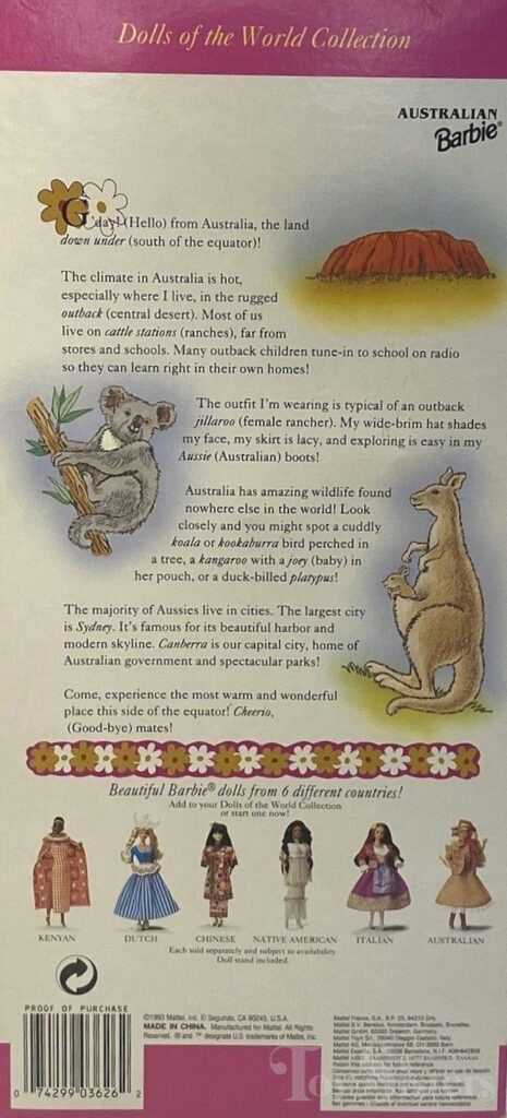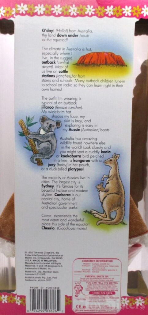 This doll was copyrighted / released in 1992 / 1993. To see other dolls from 1993, click here. She has the Superstar head mold. To see other dolls with this head mold, click here. This doll is part of the Dolls of the World series (DOTW). To see the other Dolls of the World from 1993, click here. To see all the other Dolls of the World, click here. This doll was manufactured in Malaysia and came in two box styles.