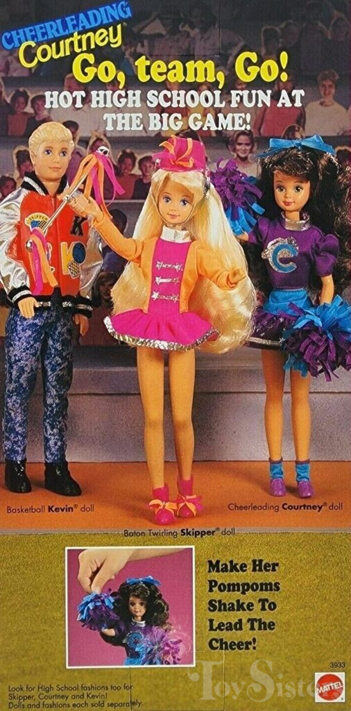 This doll was copyrighted in 1992 and released in 1993. To see other dolls from 1993, click here. She has the Teen Fun Skipper head mold. To see other dolls with this head mold, click here. To see other 1993 Skipper dolls, click here. To see other cheerleader dolls, click here. This doll was manufactured in Malaysia.