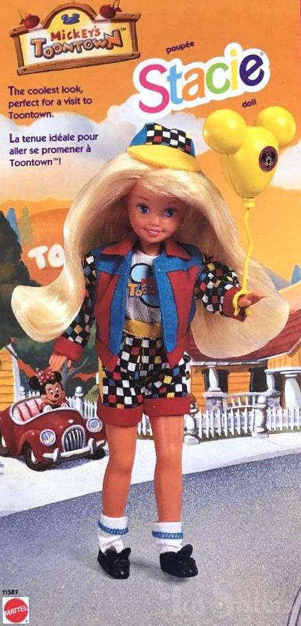 This doll was copyrighted and released in 1993. To see other dolls from 1993, click here. She has the Stacie #1 head mold. To see other dolls with this head mold, click here. To see other 1993 Stacie dolls, click here. This doll was made in Malaysia. To see other Disney themed Barbie sets, click here.