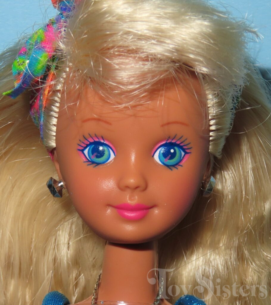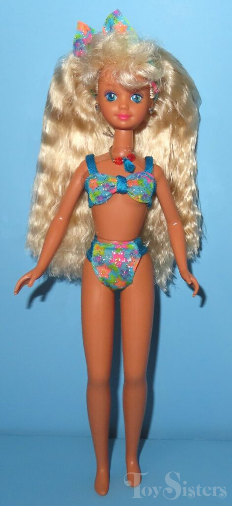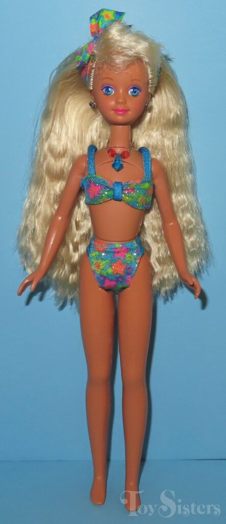 This doll was copyrighted in 1992 and released in 1993. To see other dolls from 1993, click here. She has the Teen Fun Skipper head mold. To see other dolls with this head mold, click here. To see other Glitter Beach dolls, click here. To see other Barbie beach dolls, click here. The Glitter Beach dolls can all be found in two box variations – yellow backing or blue backing. This doll was manufactured in Malaysia or China and there are visible differences between the two variations.