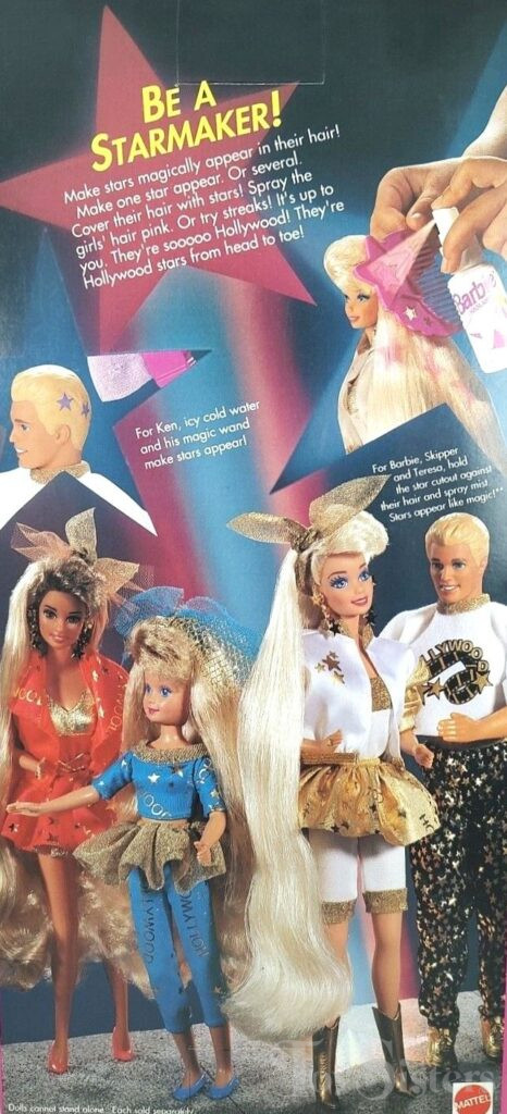 This doll was copyrighted in 1992 and released in 1993. To see other dolls from 1993, click here. She has the Teen Fun Skipper head mold. To see other dolls with this head mold, click here. To see other Hollywood Hair dolls, click here. This doll was manufactured in Malaysia and occasionally China.