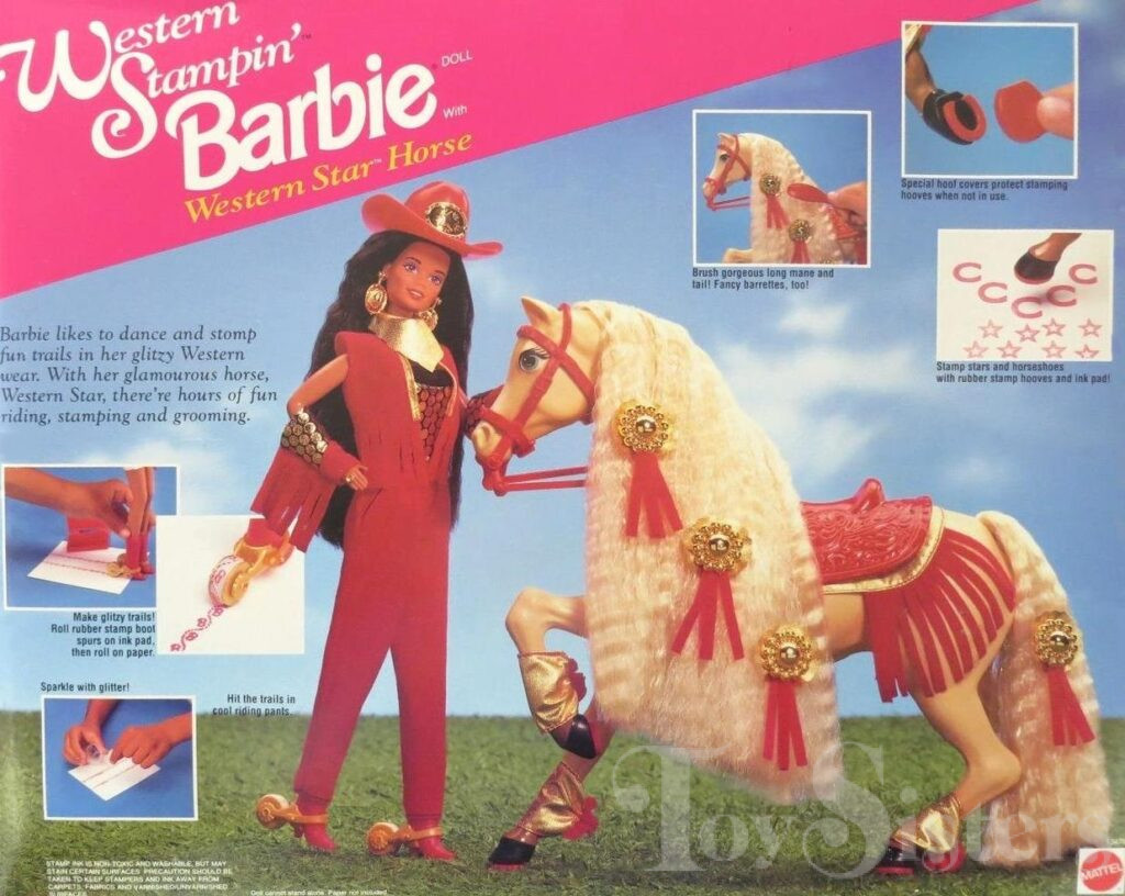 This doll was copyrighted and released in 1993. To see other dolls from 1993, click here. She has the Christie head mold. To see other dolls with this head mold, click here. To see other Western Stampin’ dolls, click here. This doll was manufactured in China. To see other Barbie horses, click here.