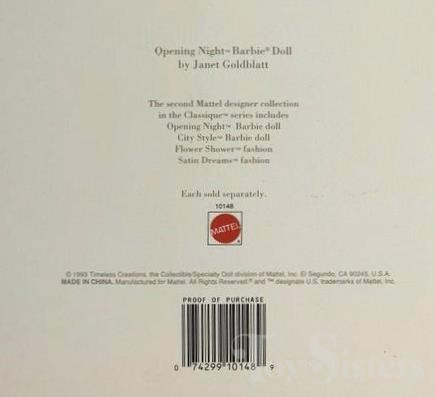 This doll was copyrighted / released in 1993. To see other dolls from 1993, click here. She has the Superstar head mold. To see other dolls with this head mold, click here. This doll was manufactured in China and was designed by Janet Goldblatt. She is part of the Classique Collection.
