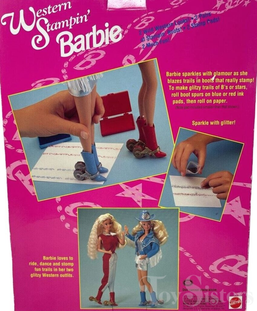 Western Stampin’ Barbie was manufactured in China and Malaysia and there are visible differences between the two variations. She also comes in a Deluxe Play Set with fashions as #10927. She was also packaged with Western Star Horse as #11020.