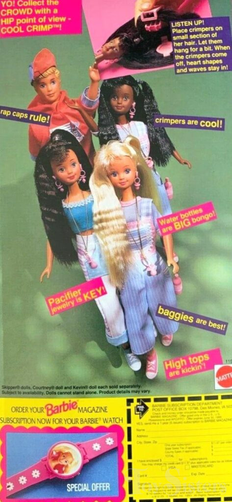 This doll was copyrighted in 1993 and released in 1994. To see other dolls from 1994, click here. She has the Teen Fun Skipper head mold. To see other dolls with this head mold, click here. To see other 1994 Skipper dolls, click here. This doll was manufactured in Malaysia and was also released in an Caucasian version.