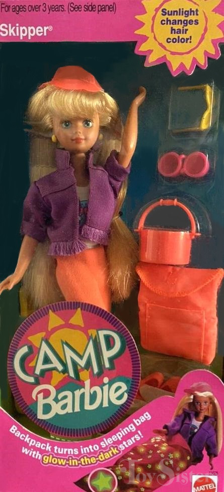 This doll was copyrighted / released in 1993 / 1994. To see other dolls from 1994, click here. She has the Teen Fun Skipper head mold. To see other dolls with this head mold, click here. To see other dolls in the Camp series, click here. The hair of these dolls changes color in the sunlight.