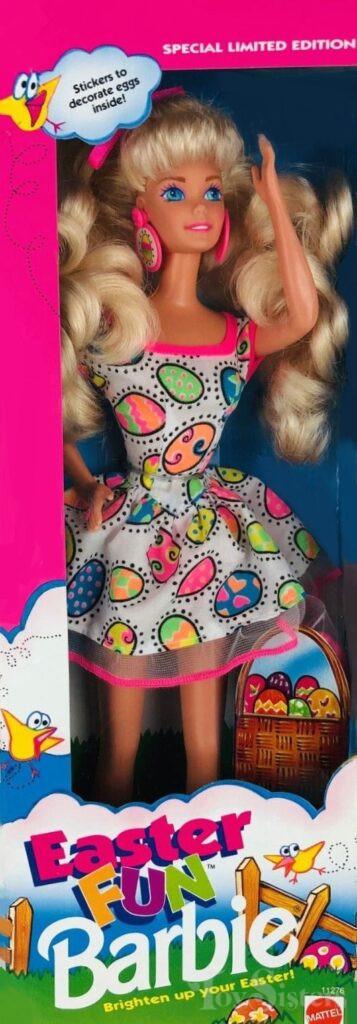 This doll was copyrighted / released in 1993 / 1994. To see other dolls from 1994, click here. She has the Superstar head mold. To see other dolls with this head mold, click here. This doll was manufactured in Malaysia. To see other Easter Barbie dolls, click here.