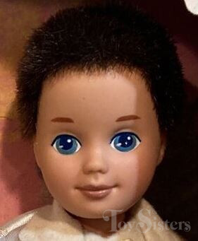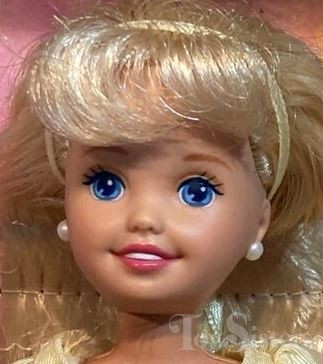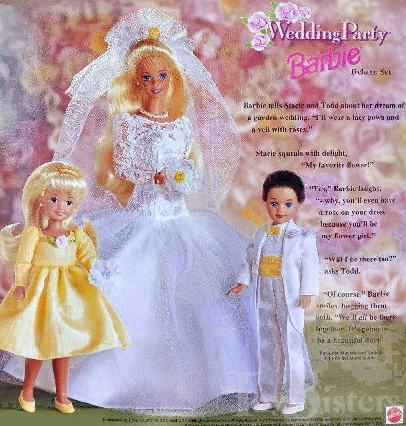 This doll set was copyrighted and released in 1994. To see other dolls from 1994, click here. Barbie has the Superstar head mold. To see other dolls with the Superstar head mold, click here. Stacie has the Stacie #1 head mold. Todd has the Todd head mold. This doll set was manufactured in Malaysia. To see other bride dolls, click here. This doll set was also available in an African American version.