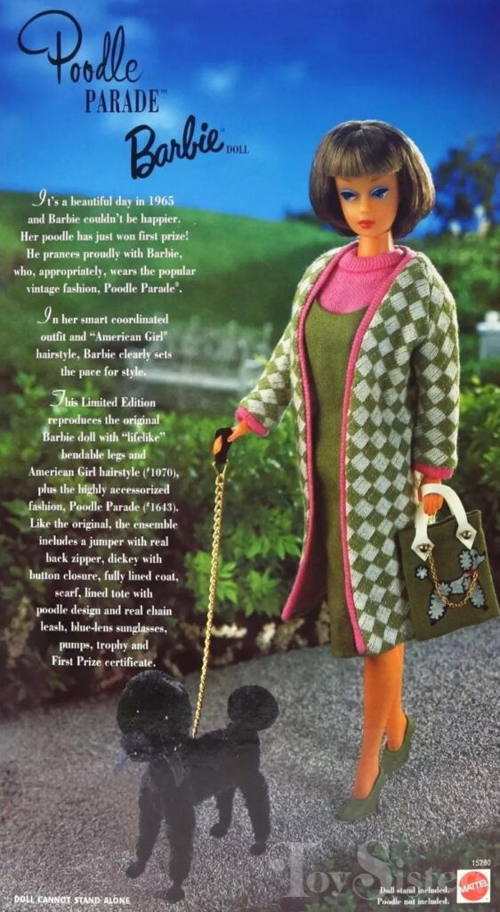This doll was copyrighted / released in 1995 / 1996. To see other dolls from 1996, click here. She has the Vintage Reproduction head mold. To see other dolls with this head mold, click here. She is a reproduction of the 1965 Poodle Parade doll and was manufactured in Malaysia.
