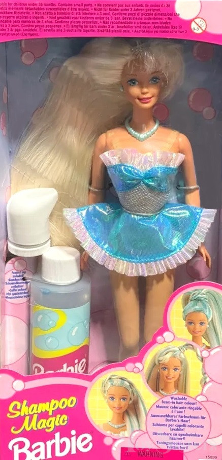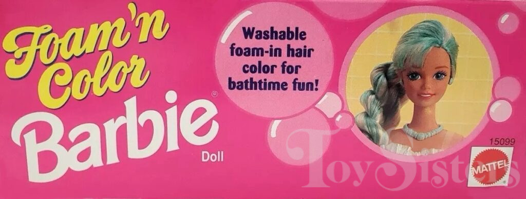 This doll was copyrighted / released in 1995 / 1996. To see other dolls from 1996, click here. She has the Superstar head mold. To see other dolls with this head mold, click here. This doll was manufactured in China. Foam ‘n Color Barbie also came in pink and yellow and was released under the name Shampoo Magic in some markets.