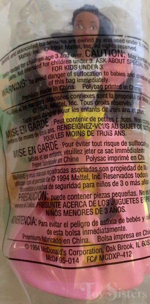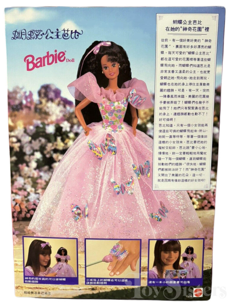 This doll was copyrighted / released in 1994 / 1995. To see other dolls from 1995, click here. She has the Teresa head mold. To see other dolls with this head mold, click here. This doll was manufactured in Indonesia. She also comes packaged in a Japanese box. To see other Butterfly Princess dolls, click here.