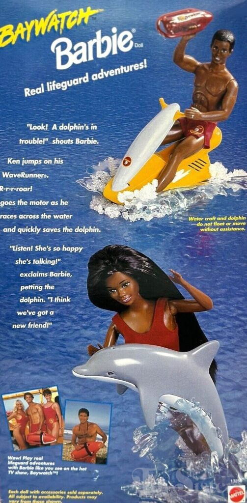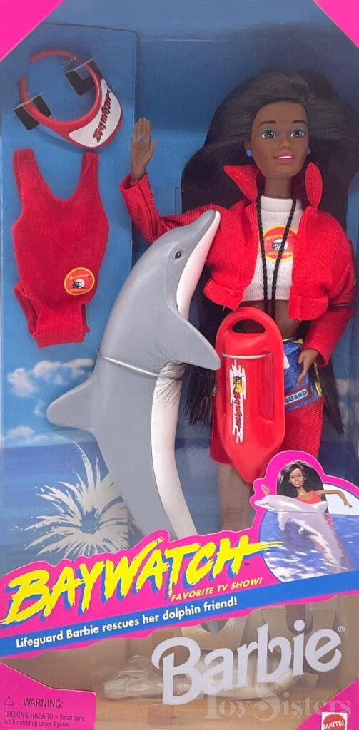 This doll was copyrighted / released in 1994 / 1995. To see other dolls from 1995, click here. She has the Christie head mold. To see other dolls with this head mold, click here. This doll was manufactured in China or Malaysia and there are discernible differences between the two. Also, Baywatch Barbie was released in two different box styles. To see other Baywatch dolls, click here.