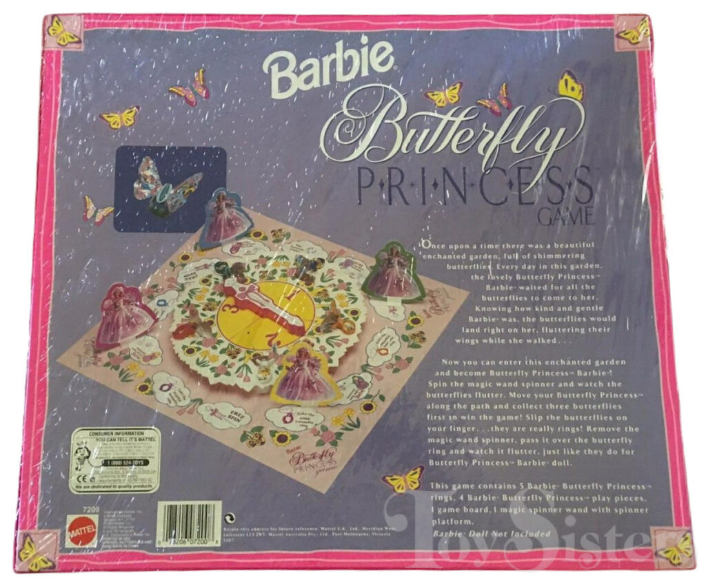 This doll was copyrighted / released in 1994 / 1995. To see other dolls from 1995, click here. She has the Superstar head mold. To see other dolls with this head mold, click here. This doll was manufactured in China or Indonesia and there are discernible differences between the two. To see other Butterfly Princess dolls, click here.