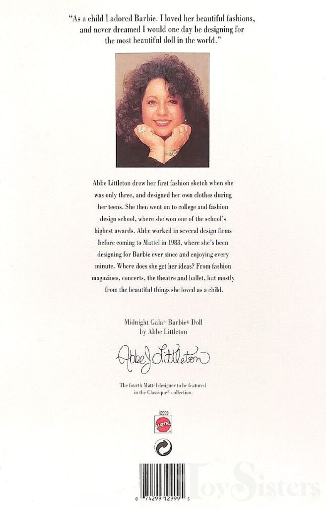 This doll was copyrighted / released in 1995. To see other dolls from 1995, click here. She has the Superstar head mold. To see other dolls with this head mold, click here. This doll was manufactured in China and was designed by Abbe Littleton. She is part of the Classique Collection.