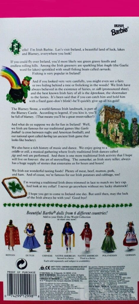 Irish Barbie is part of the Dolls of the World series (DOTW). To see the other Dolls of the World from 1995, click here. To see all the other Dolls of the World, click here.