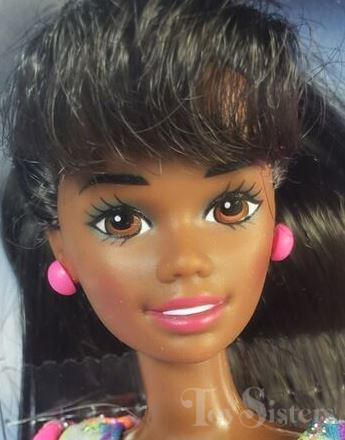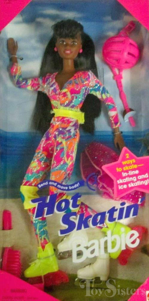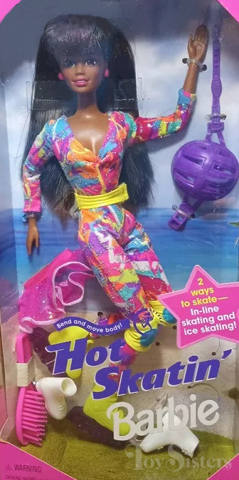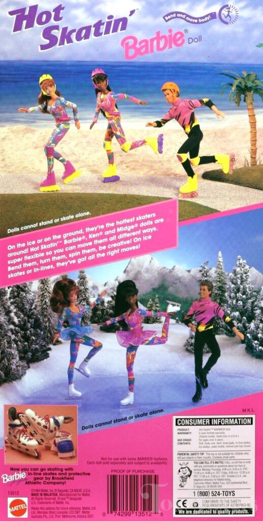 This doll was copyrighted / released in 1994 / 1995. To see other dolls from 1995, click here. She has the Christie head mold. To see other dolls with this head mold, click here. This doll was manufactured in Malaysia and comes with accessories (helmet / water bottle/ skate wheels) that can be either pink or purple. She also comes in two different box set-ups, and a Caucasian version. To see other Hot Skatin’ dolls, click here.