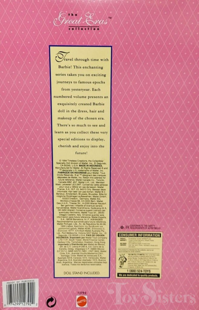 This doll was copyrighted / released in 1994 / 1995. To see other dolls from 1995, click here. She has the Superstar head mold. To see other dolls with this head mold, click here. This doll was manufactured in Indonesia. She is part of the Great Eras Collection.