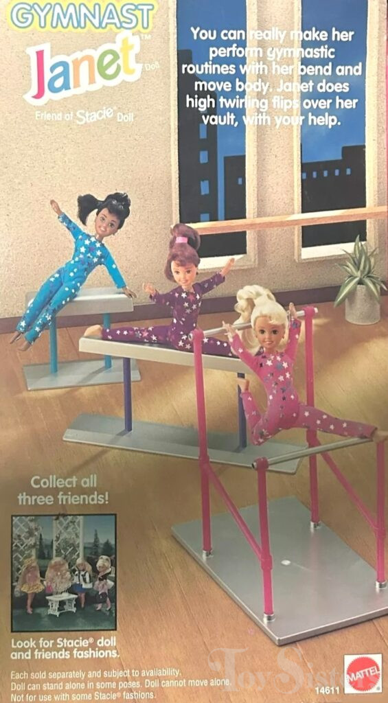 This doll was copyrighted / released in 1995 / 1996. To see other dolls from 1996, click here. She has the Stacie #1 head mold. To see other dolls with this head mold, click here. This doll was manufactured in Malaysia. To see other Gymnast Stacie dolls, click here.