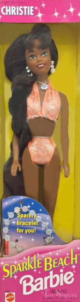 Sparkle Beach Christie was manufactured in Malaysia. She can be found with regular-length hair or long, twirled hair.