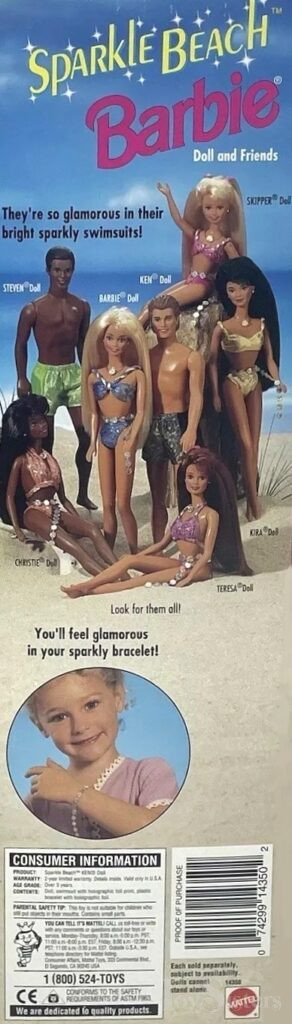 This doll was copyrighted in 1995 and released in 1996. To see other dolls from 1996, click here. He has the Alan head mold. To see other dolls with this head mold, click here. To see other Sparkle Beach dolls, click here. To see all other Barbie beach dolls, click here.