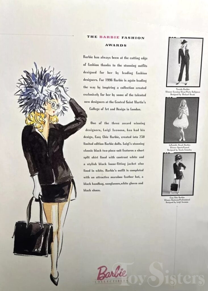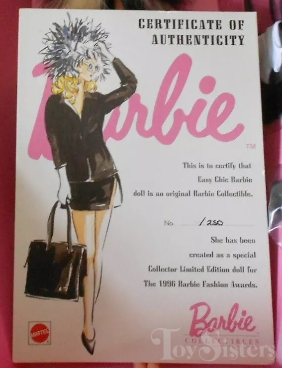 This doll was copyrighted / released in 1996. To see other dolls from 1996, click here. She has the Superstar head mold. To see other dolls with this head mold, click here. This doll was manufactured in China (outfit made in England) and is a limited edition of 250 pieces.