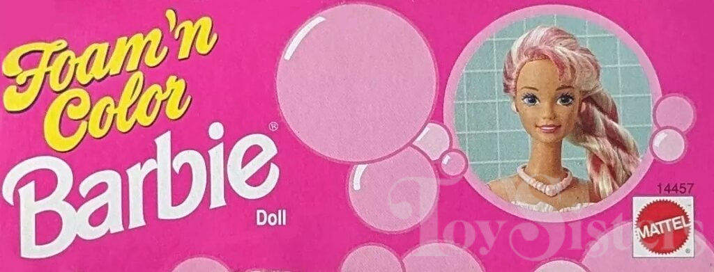 This doll was copyrighted / released in 1995 / 1996. To see other dolls from 1996, click here. She has the Superstar head mold. To see other dolls with this head mold, click here. This doll was manufactured in China. Foam ‘n Color Barbie also came in blue and yellow and was released under the name Shampoo Magic in some markets.